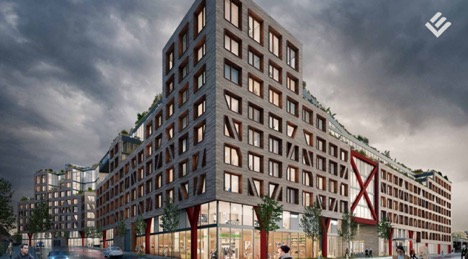 The first affordable housing lottery at the former Rheingold Brewery in Bushwick has opened, and 183 units are available, starting at $947 a month. They are located at 54 Noll Street and 123 Melrose Street in the complex developed by All Year and designed by ODA that covers two blocks at the southern end of the sprawling site.