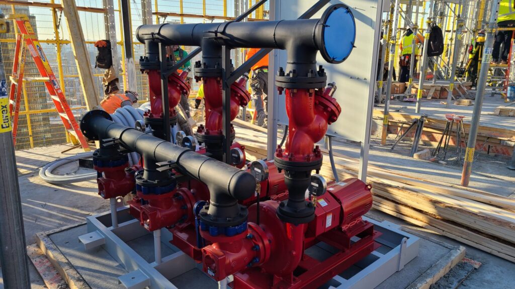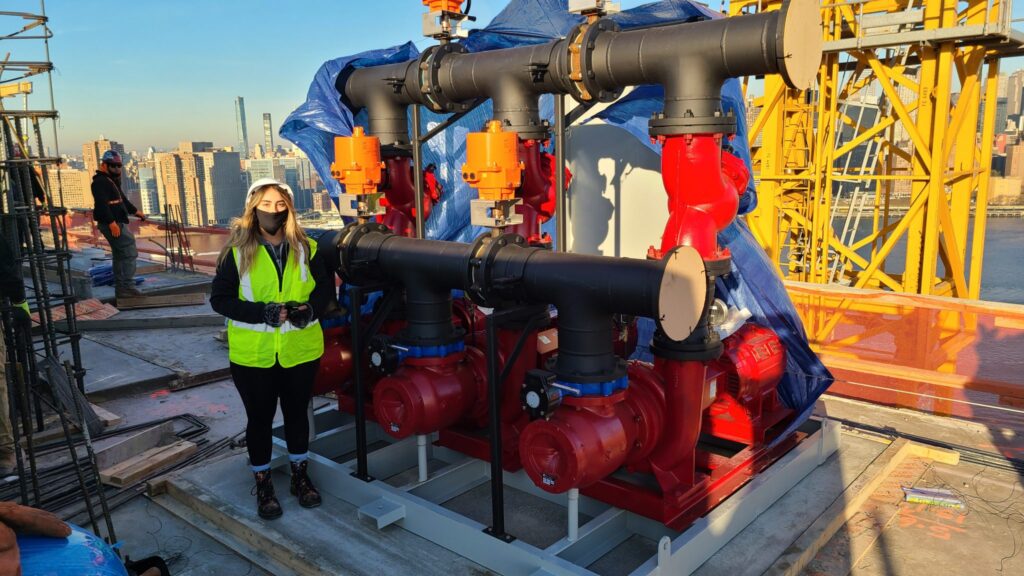Fallon Blacharski at jobsite coordination inspecting a Tisdale Manufacturing Triplex Pump Skid